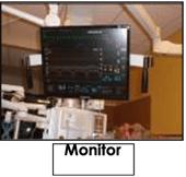 • Monitor: Una pantalla de televisión con líneas serpenteantes en ella. El monitor se conecta a máquinas que les brindan información importante a los médicos y enfermeras.