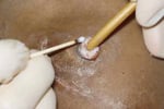 5. Tome un palillo y aplíquelo suavemente con toquecitos o ruédelo en el tejido de granulación. Se va a poner gris o blanco cuando lo trate. El medicamento en el palillo cambiará de color de café a blanco. Esto es normal. Siga aplicando el medicamento en el tejido de granulación
