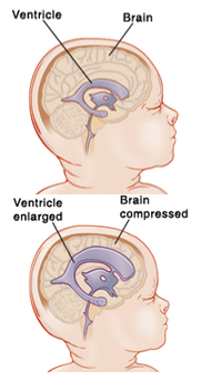 With hydrocephalus, the CSF builds up in the ventricles. This causes the ventricles to expand and push on the brain.